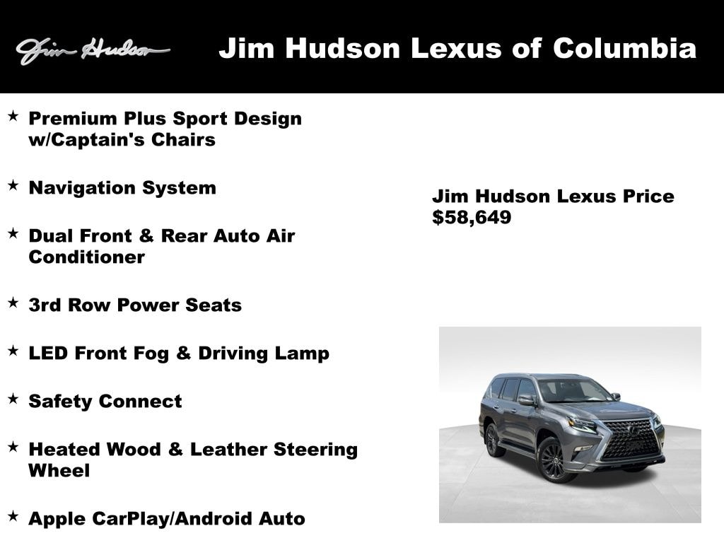 2023 Lexus GX 460 2nd Row Captain's Chairs, 3rd Row Power Seats, Apple CarPlay/Android Auto, Dual Front & Rear Auto Air Conditioner, Front & Rear Heated Seats, Heated Wood & Leather Steering Wheel, LED Front Fog & Driving Lamp, Navigation System, NuLuxe Seat Trim (EA), Premium Plus Sport Design w/Captain's Chairs, Safety Connect, Ventilated Front Seats, Wheels: 19" x 7.5J Dark Gray Metallic Alum Alloy, Windshield De-Icer, Windshield Wiper Control w/Rain Sensor.