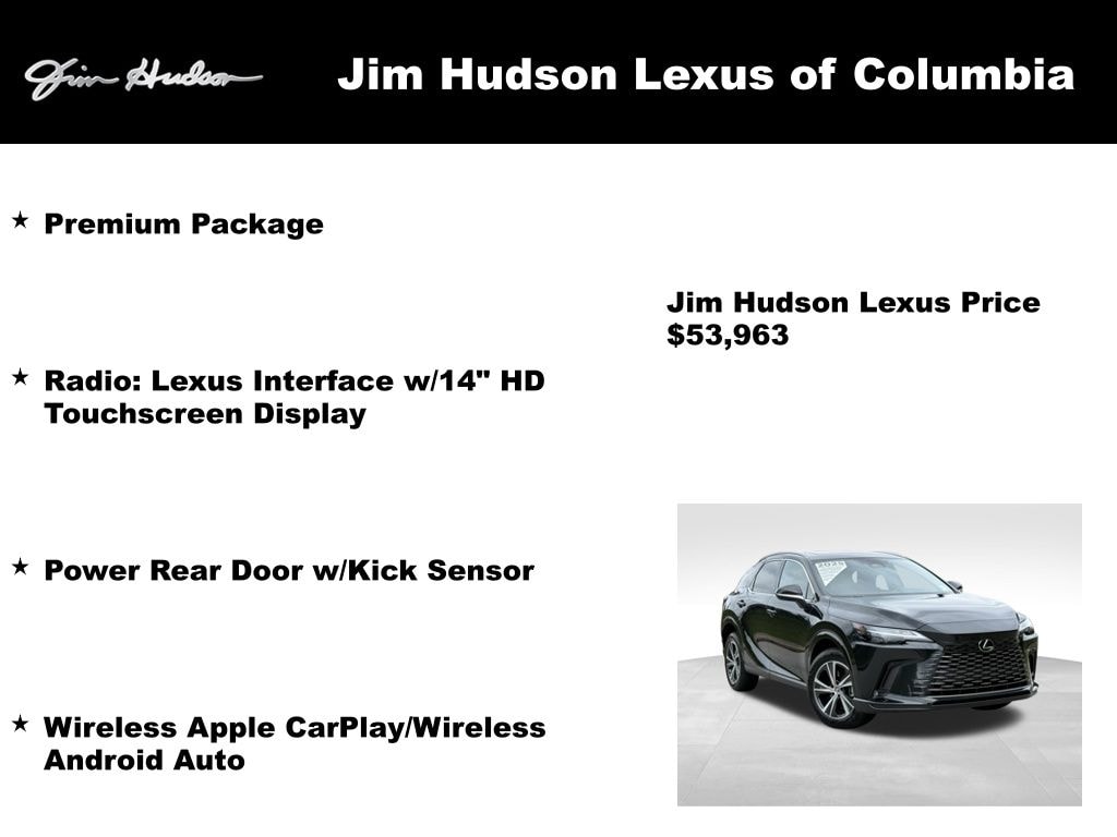 2025 Lexus RX 350 Premium Black w/Black Open Pore w/NuLuxe Seat Trim, Power Rear Door w/Kick Sensor, Premium Package, Radio: Lexus Interface w/14" HD Touchscreen Display, Wireless Apple CarPlay/Wireless Android Auto.