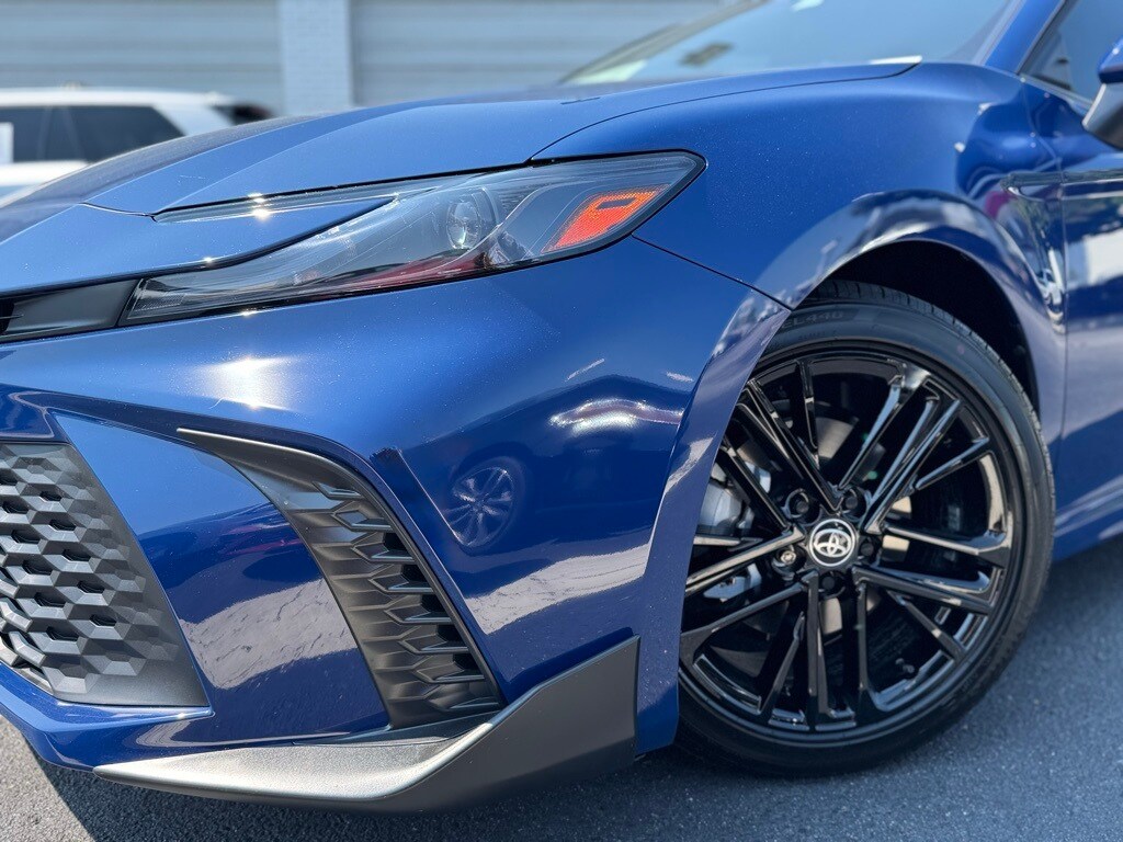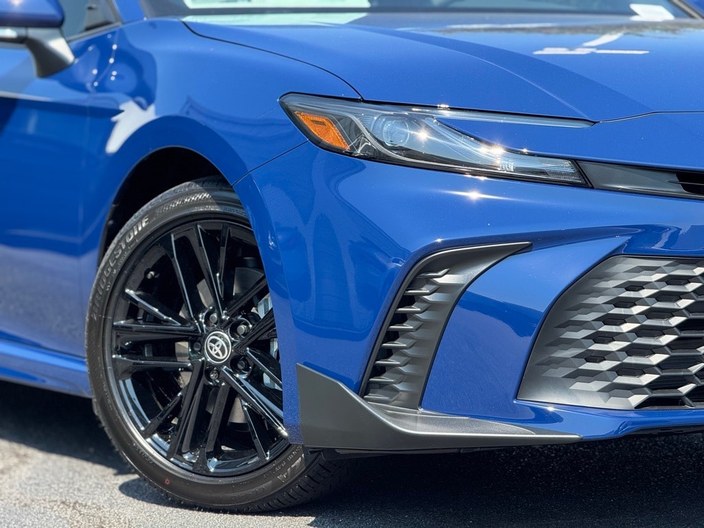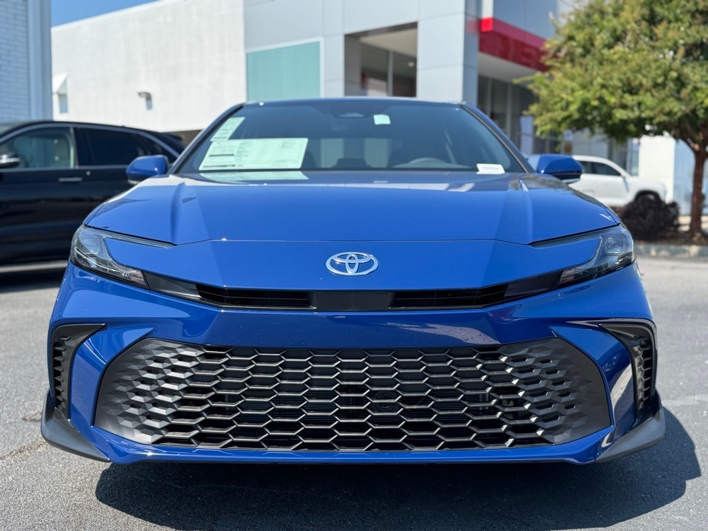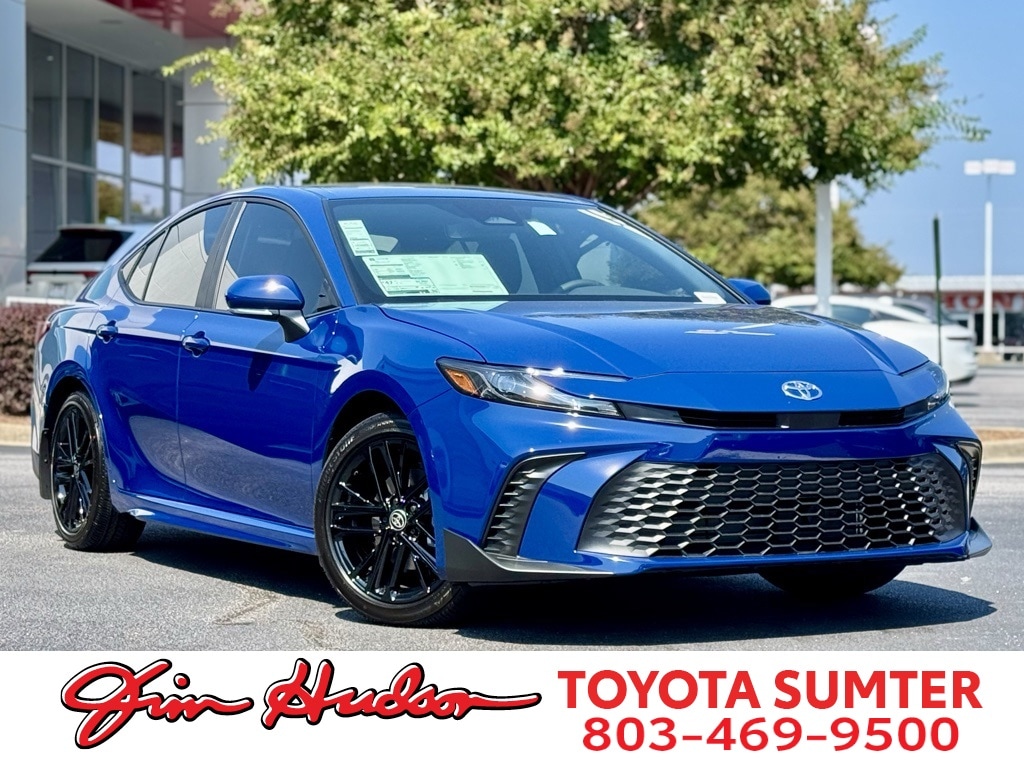 Blue 2025 Toyota Camry SE FWD eCVT 2.5L 4-Cylinder 16V DOHC 2.5L 4-Cylinder 16V DOHC, Blk W Sporty Bold Artificial Leather, 4-Wheel Disc Brakes, 6 Speakers, ABS brakes, Air Conditioning, Alloy wheels, AM/FM radio: SiriusXM, Apple CarPlay/Android Auto, Auto High-beam Headlights, Automatic temperature control, Brake assist, Bumpers: body-color, Delay-off headlights, Driver door bin, Driver vanity mirror, Dual front impact airbags, Dual front side impact airbags, Electronic Stability Control, Emergency communication system: Safety Connect (up to 10-year trial subscription), Exterior Parking Camera Rear, Four wheel independent suspension, Front anti-roll bar, Front Bucket Seats, Front Center Armrest, Front dual zone A/C, Front reading lights, Fully automatic headlights, Heated door mirrors, Illuminated entry, Knee airbag, Leather Shift Knob, Leather steering wheel, Low tire pressure warning, Occupant sensing airbag, Outside temperature display, Overhead airbag, Overhead console, Panic alarm, Passenger door bin, Passenger vanity mirror, Power door mirrors, Power driver seat, Power steering, Power windows, Radio data system, Radio: Toyota Audio Multimedia w/12.3" Touchscreen, Radio: Toyota Audio Multimedia w/8" Touchscreen, Rear anti-roll bar, Rear reading lights, Rear seat center armrest, Rear side impact airbag, Rear window defroster, Remote keyless entry, Security system, SofTex & Fabric Seat Trim, Speed control, Speed-sensing steering, Split folding rear seat, Spoiler, Steering wheel mounted audio controls, Telescoping steering wheel, Tilt steering wheel, Traction control, Trip computer, Turn signal indicator mirrors, Variably intermittent wipers, Wheels: 18" Black-Finished Alloy, 2.5L 4-Cylinder 16V DOHC, Blk W Sporty Bold Artificial Leather.