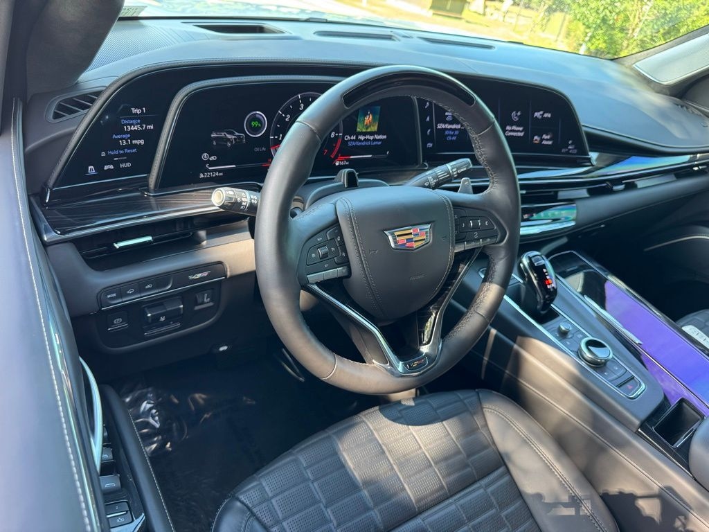 2023 Cadillac Escalade V-Series AWD, Jet Black Leather, 16.9" Diagonal OLED Infotainment Screen, 2-Presets Memory For Driver Seat Adjuster, 3 Years of OnStar & Connected Services Plan, 3.23 Axle Ratio, 3rd row seats: split-bench, 4-Way Power Driver Lumbar Seat Adjuster, 4-Way Power Front Passenger Lumbar Seat Adjuster, 4-Wheel Disc Brakes, 8-Way Power Driver Seat Adjuster, 8-Way Power Front Passenger Seat Adjuster, A/V remote, ABS brakes, Active Noise Cancellation, Adaptive Cruise Control, Adaptive suspension, Air Conditioning, Air Ride Adaptive Suspension, AKG Studio Reference 36-Speaker Audio System, All-Weather Integrated Cargo Liner (LPO), Alloy wheels, AM/FM radio: SiriusXM with 360L, Apple CarPlay/Android Auto, Audio memory, Auto High-beam Headlights, Auto tilt-away steering wheel, Auto-dimming door mirrors, Auto-dimming Rear-View mirror, Automatic Seat Belt Tightening, Automatic temperature control, Body-Color Door Handles, Brake assist, Bumpers: body-color, Compass, Cooled Console w/Covered Storage, Delay-off headlights, Door auto-latch, Door Lock & Latch Shields, Driver door bin, Driver vanity mirror, Dual front impact airbags, Dual front side impact airbags, Electronic Limited-Slip Differential, Electronic Stability Control, Emergency communication system: OnStar and Cadillac connected services capable, Enhanced Automatic Emergency Braking, Enhanced Automatic Parking Assist, Exterior Parking Camera Rear, Floor Console w/Covered Storage, Four wheel independent suspension, Front anti-roll bar, Front Auxiliary 12-volt Power Outlet, Front Bucket Seats, Front Center Armrest w/Storage, Front dual zone A/C, Front reading lights, Full Semi-Aniline Leather Seat Trim, Fully automatic headlights, Garage door transmitter, Genuine wood console insert, Genuine wood dashboard insert, Genuine wood door panel insert, Glass Breakage Sensor, HD Radio, Headphones, Heads-Up Display, Heated & Ventilated Driver & Front Passenger Seats, Heated door mirrors, Heated Driver & Front Passenger Seats, Heated front seats, Heated rear seats, Heated steering wheel, Hitch Guidance w/Hitch View, Illuminated entry, Illuminating Front & Rear Sill Plates, Integrated Trailer Brake Controller, Leather steering wheel, Low tire pressure warning, Magnetic Ride Control Suspension, Memory seat, Navigation System, Night vision lights, Not Equipped w/2nd Row Express-Up Window Control, Occupant sensing airbag, Outside temperature display, Overhead airbag, Overhead console, Panic alarm, Passenger door bin, Passenger vanity mirror, Platinum Interior Trim, Power door mirrors, Power driver seat, Power Liftgate, Power Lumbar Massage Driver Seat, Power Lumbar Massage Front Passenger Seat, Power moonroof, Power Panoramic Tilt-Sliding Sunroof, Power passenger seat, Power steering, Power windows, Power-Retractable Assist Steps, Preferred Equipment Group 1SD, Radio data system, Radio: AM/FM w/Navigation, Rain sensing wipers, Rear air conditioning, Rear anti-roll bar, Rear audio controls, Rear Camera Mirror, Rear Camera Mirror Washer, Rear Cross Traffic Alert, Rear reading lights, Rear Seat Entertainment System, Rear window defroster, Rear window wiper, Reconfigurable Full-Color Head-Up Display, Remote keyless entry, Reverse Automatic Braking, Security system, SiriusXM w/360L, Smart Trailer Integration Indicator, Soft Closing Front & Rear Doors, Speed control, Split folding rear seat, Spoiler, Steering wheel memory, Steering wheel mounted audio controls, Super Cruise, Tachometer, Teen Driver, Telescoping steering wheel, Theft-Deterrent Alarm System, Tilt steering wheel, Touring Package, Traction control, Trailer Side Blind Zone Alert, Trip computer, Turn signal indicator mirrors, Variably intermittent wipers, Vehicle Inclination Sensor, Vehicle Interior Movement Sensor, Ventilated front seats, Voltmeter, Wheels: 22" 18-Spoke Alloy, Wireless Apple CarPlay/Wireless Android Auto, AWD, Jet Black