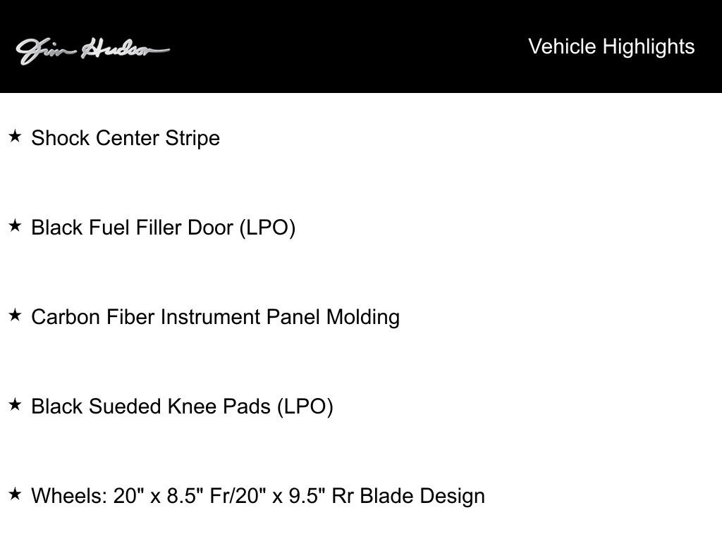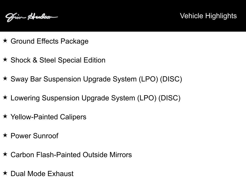 2023 Chevrolet Camaro SS Black Fuel Filler Door (LPO), Black Sueded Knee Pads (LPO), Carbon Fiber Instrument Panel Molding, Carbon Flash-Painted Outside Mirrors, Dual Mode Exhaust, Ground Effects Package, Lowering Suspension Upgrade System (LPO) (DISC), Power Sunroof, Shock & Steel Special Edition, Shock Center Stripe, Sway Bar Suspension Upgrade System (LPO) (DISC), Wheels: 20" x 8.5" Fr/20" x 9.5" Rr Blade Design, Yellow-Painted Calipers.